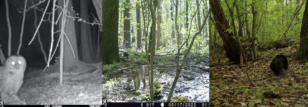 A few highlights from the trail cameras at our UNH Vernal Pool Phenology Project study pools in spring 2022: barred owl, bobcat, beaver (left to right).